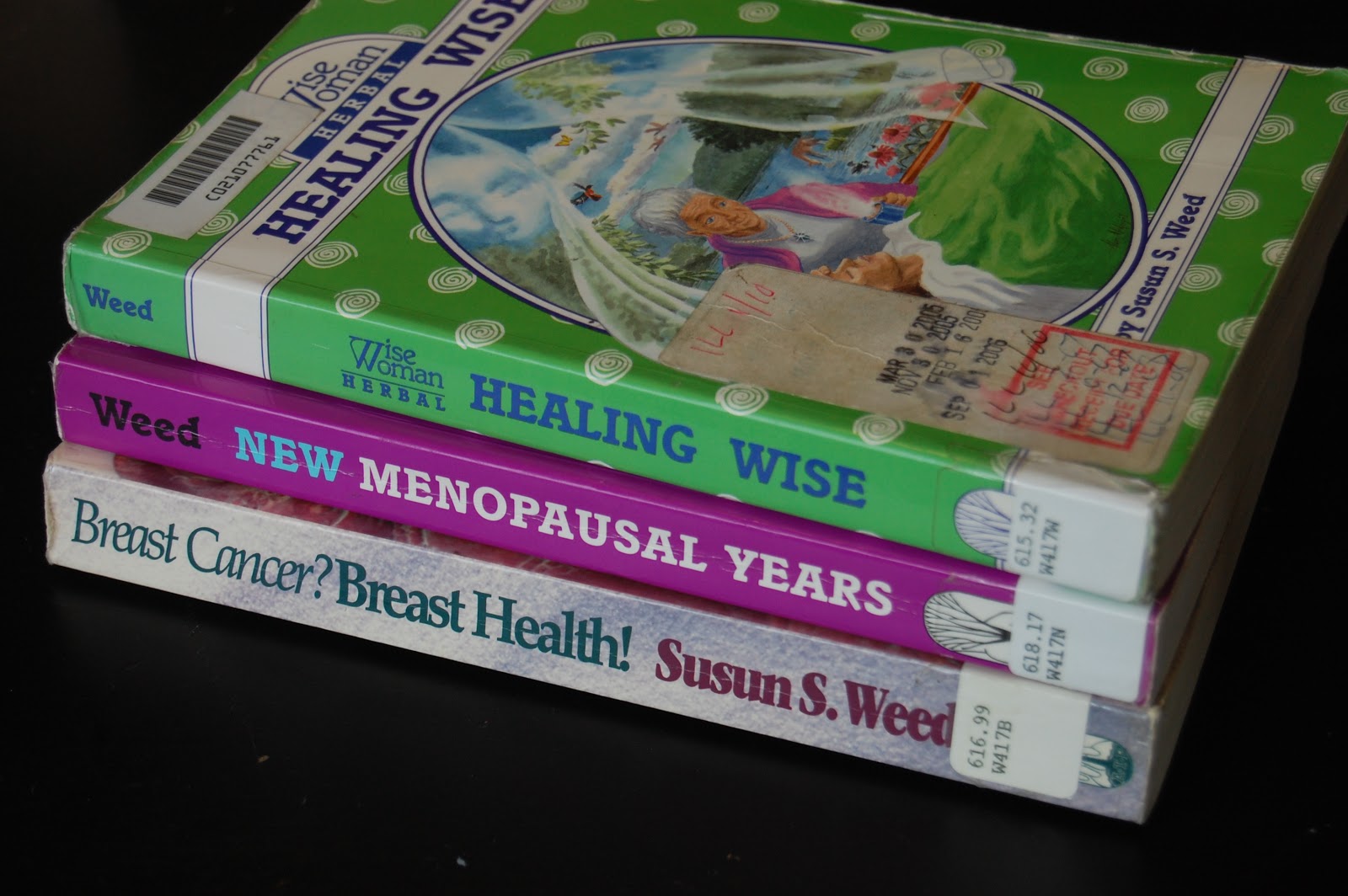 I'm currently reading three books by Susun Weed: Healing Wise, New Menopausal Years, and Breast Cancer? Breast Health!